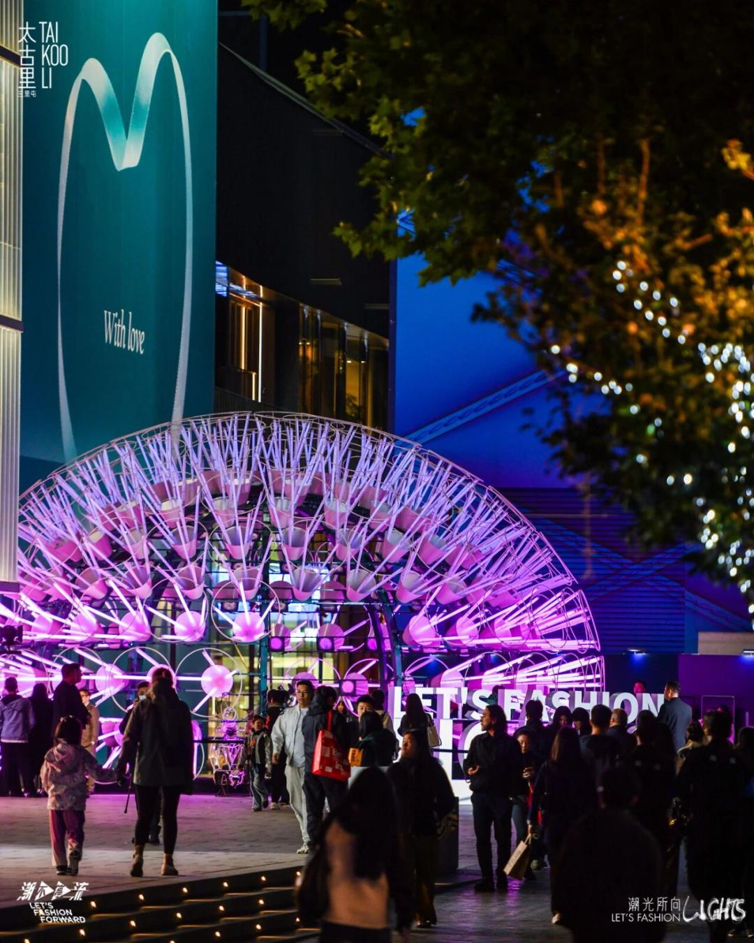 此外,三里屯太古里的灯光艺术已走过十余年深耕之路,自2013年首次引入国际知名灯光艺术作品起,便以每年不间断的创意呈现,成为北京夜经济中极具艺术感的标志性活动。如,2023年展出了由澳大利亚AMIGO&AMIGO工作室创作的“电光竖琴”和“触光捕乐”互动装置;2024年灯光节则带来了“蒲公英”中国首展和“变形记”全球首展。2025年的The Stage主舞台呈现【登台亮相:出色手艺】,以“灯光”为媒介,用红色灯球营造独特氛围,成为“潮流碰撞、文化发声”的全新场域。