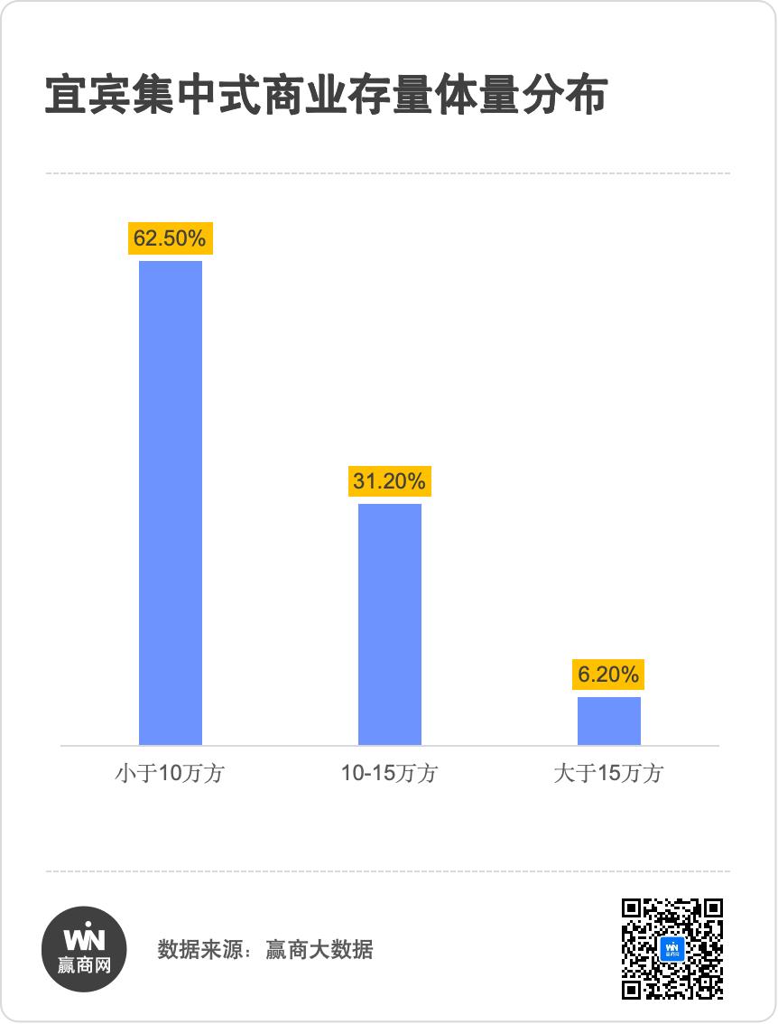赢商大数据显示,宜宾现有存量商业体量已突破124万㎡,主要集中在翠屏区与叙州区。以中小型商业(体量<10万㎡)为主,占比高达62.5%。