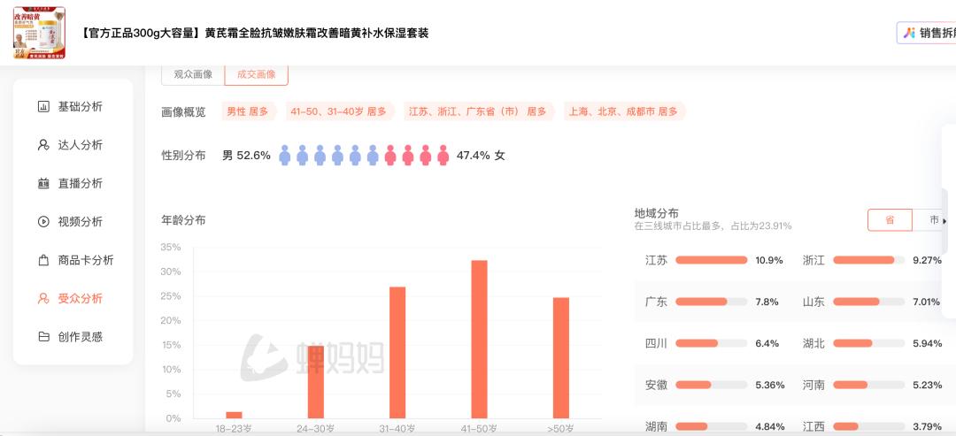 抖音商家“倾姿堂个人护理旗舰店”页面显示,其单价为29.9元的黄芪霜产品套装已卖出了1.5万份。蝉妈妈显示,该产品成交用户中,41岁以上用户占比超过50%,男性用户占比达到52.6%。
