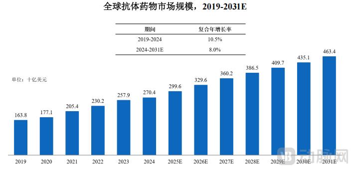 最后是市场增长潜力。千鼠万抗为抗体药物开发提供解决方案,最终能走多远,要看抗体药物市场的长期需求。目前看来,全球抗体药物市场规模将在很长一段时间内保持增长。
