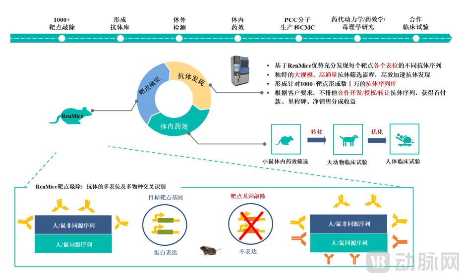 所谓“千鼠万抗”,即在RenMice小鼠平台的基础上,通过靶点敲除,得到针对人体内千余种潜在药物靶点的靶点敲除(Target KO)小鼠,进行药物发现,是为“千鼠”;针对每种Target KO小鼠免疫后,又得到数百种针对该靶点不同表位的抗体分子,是为“万抗”。