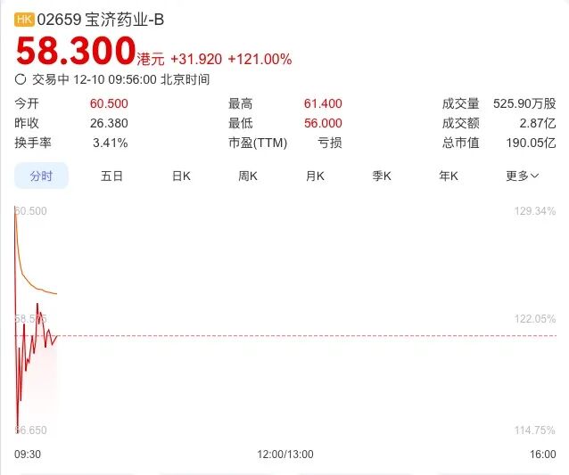 12月10日,来自上海宝山区的上海宝济药业股份有限公司(简称:宝济药业)正式登陆港交所,发行价为26.38港元/股,开盘价为60.5港元/股,暴涨129%,随后股价有所轻微下滑,截至9:56,股价为58.3港元/股,市值190.05亿港元(约合172.5亿港元)。