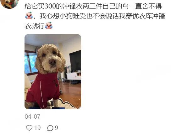 穿衣打扮更是双标现场:自己主打一个牛马恶心穿搭,毛孩子的衣柜却是冲锋衣、羽绒服、亲子装堆满,每天都要给它搭出最靓的OOTD;