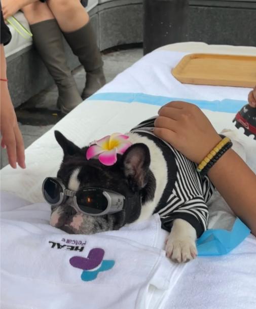人类吃饱了搓个澡,猫狗吃饱了也有“放松疗愈”——泡泡浴、面膜、精油SPA只能算“基础清洁套餐”。有宠物疗养中心直接整了个度假风室外按摩店,躺椅一摆、绿植一围、墨镜一带,狗狗趴在上面享受按摩,那松弛感堪比巴厘岛度假,舒服到连尾巴都懒得摇。