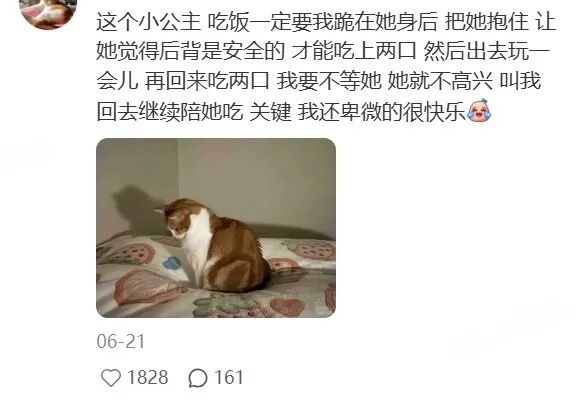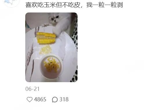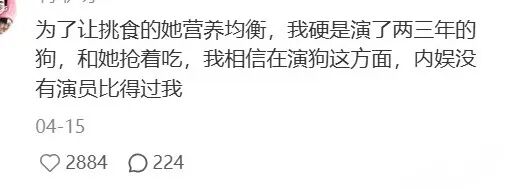 为了哄毛孩子吃饭,铲屎官们各显神通——从背后抱住喂、剥掉玉米粒皮、一粒一粒滑着玩,甚至假装成狗抢着吃,全程心甘情愿毫无怨言,还自嘲道:“比演狗,内娱没有演员比得上我!”搞笑中透着一股心酸。