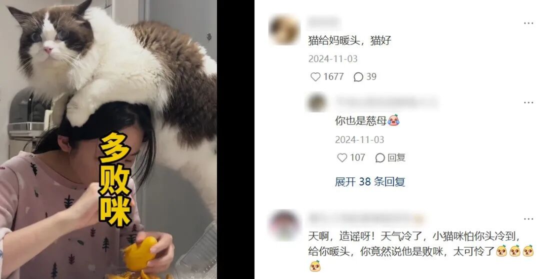 这届网友对毛孩子的宽容度更是拉满:有网友分享小猫“蹬鼻子上脸”趴在自己头顶,评论区清一色夸赞“小猫只是想给你暖头,猫好!”