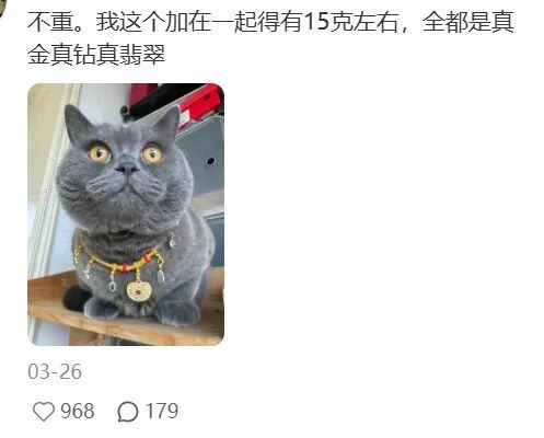 还有网友嘴上说着不买珠宝,转头就给小猫戴上了真金真钻的翡翠项链,还理直气壮:“给毛孩子买不算买!”