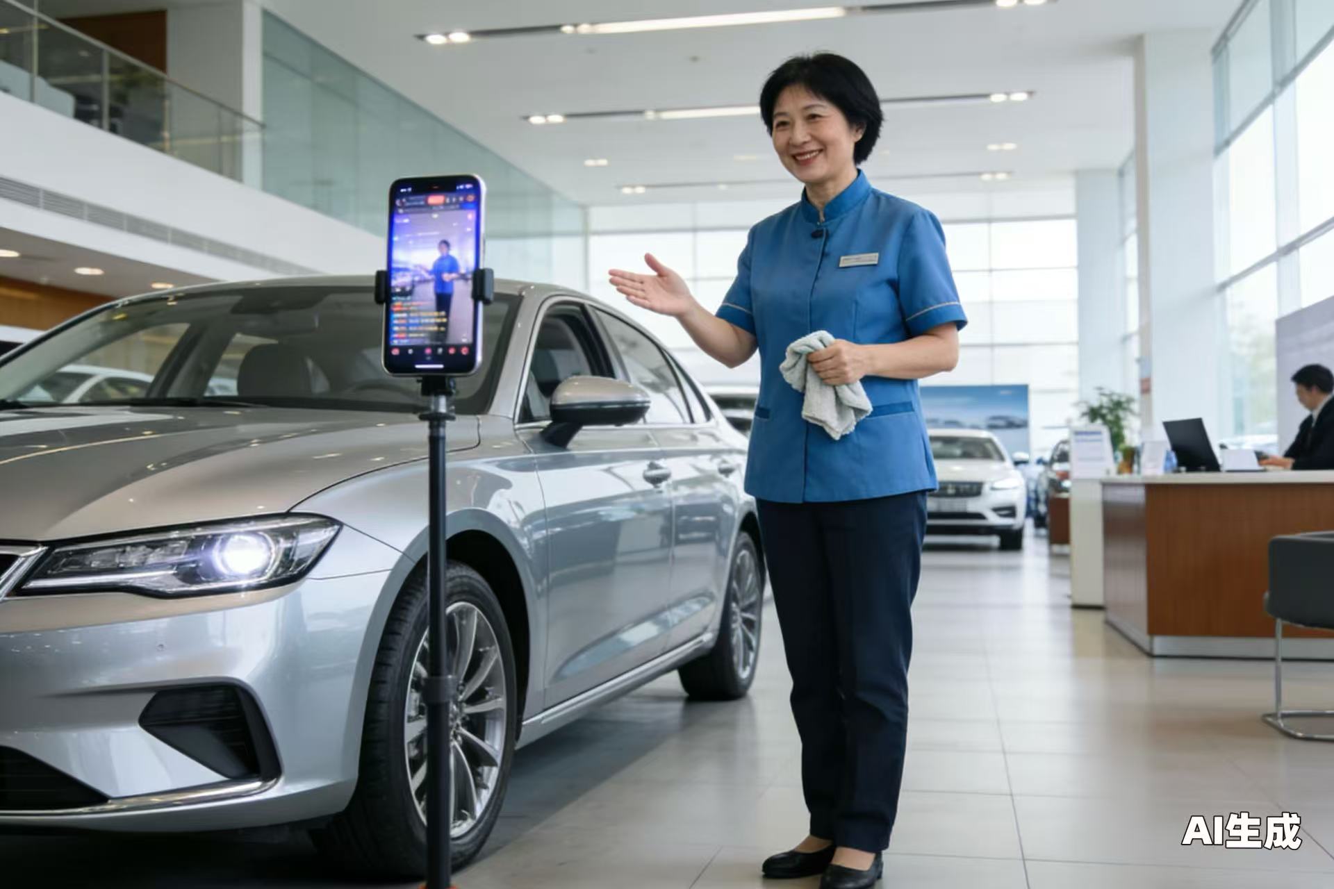 不过,如今的一些卖车直播间,主播不再是板正的俊男美女,店铺内的保洁阿姨工作之余,也可能客串一把卖车主理人。