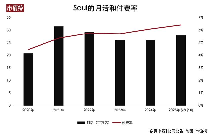 但,Soul的月活跃用户数在2021年达到3160万后便增长乏力,转而下滑,2023年和2024年,都是2620万,2025年略有增长,到了2800万。