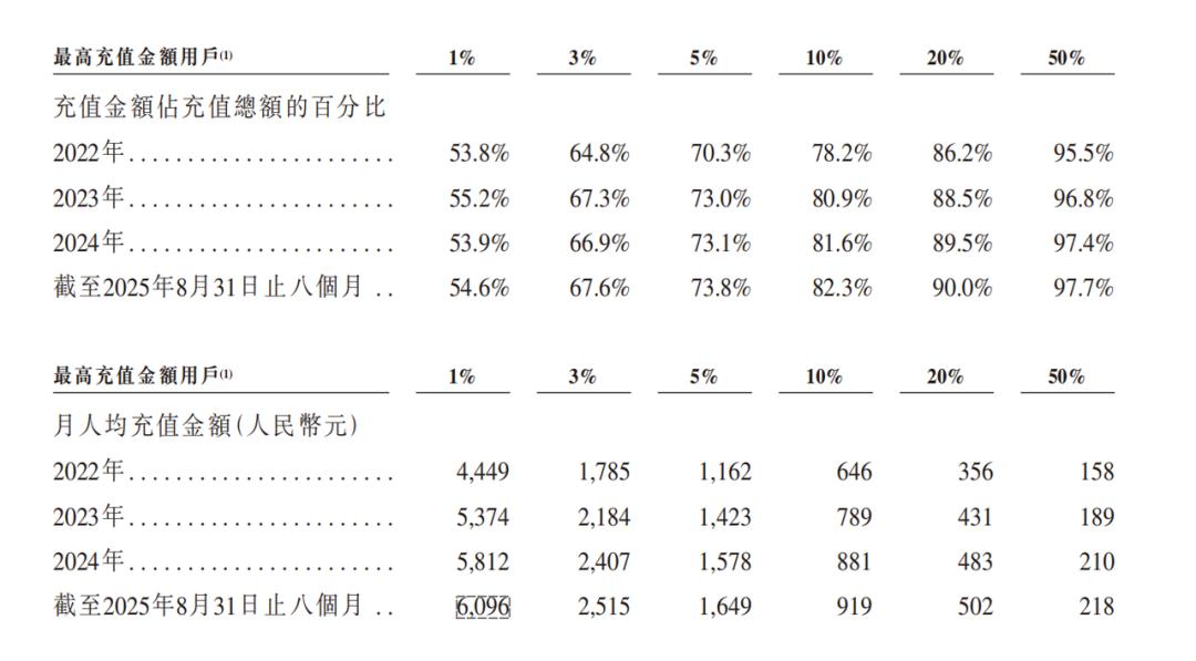 再往下看,2025年前8个月,充值金额最高的前1%用户,贡献了超过55%的总充值额,前20%的用户,贡献了90%的总充值额。