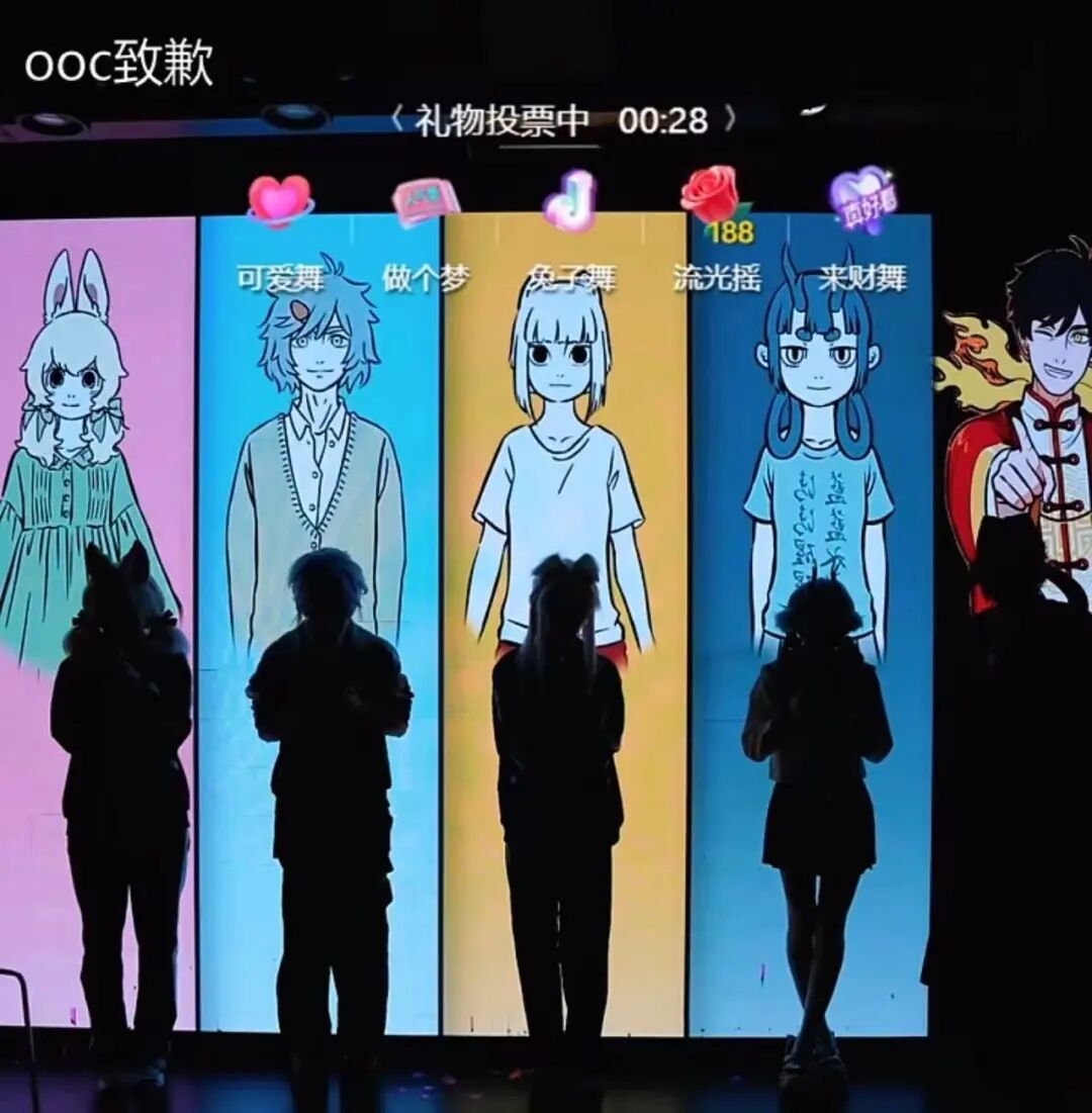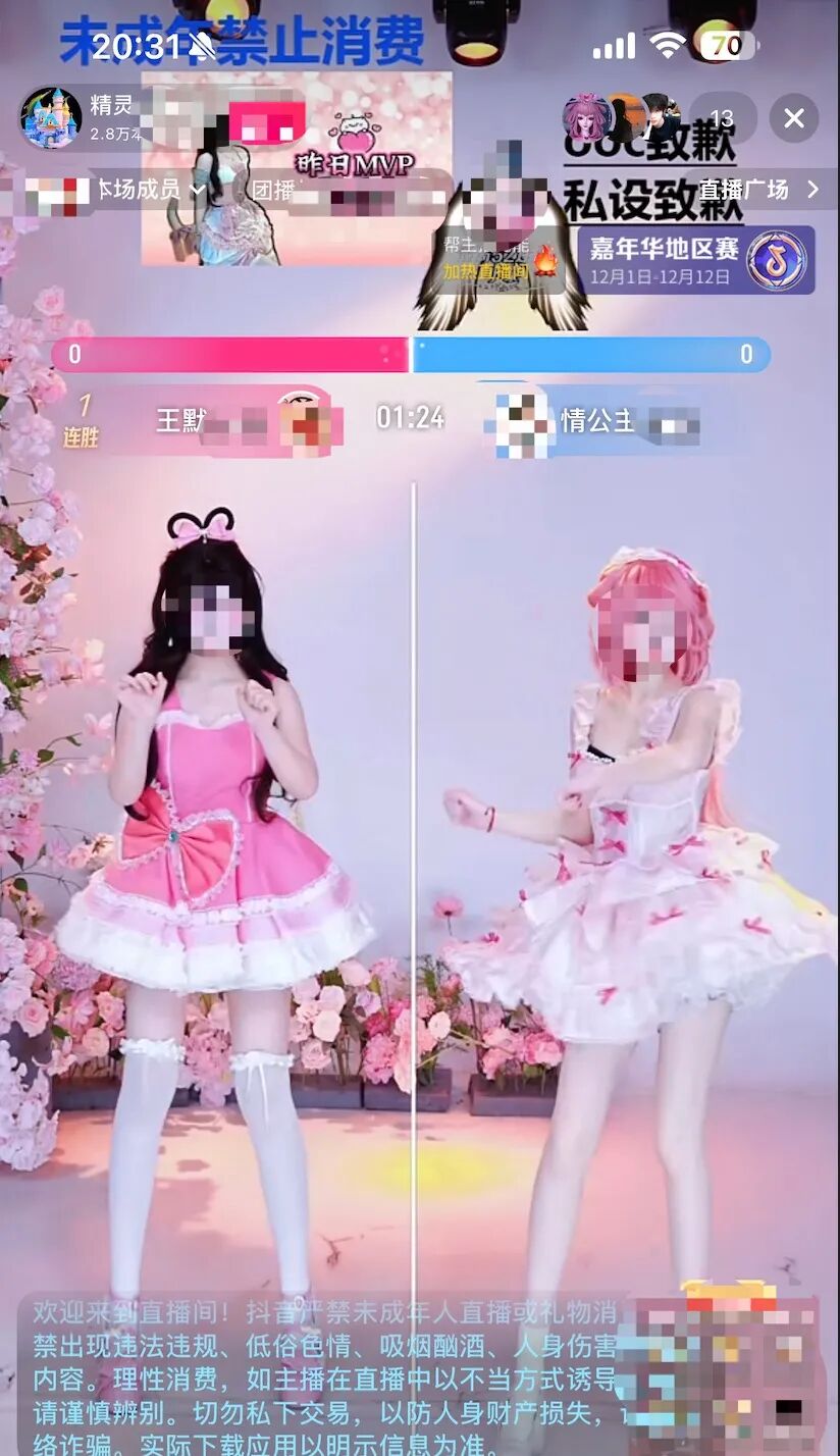 本以为这种不上不下的团播形式,很快就会被市场淘汰,但最近两个月明显感受到,抖音二次元团播正在批量复制,形式和内容更丰富了。玩法不再局限于关灯投票,团播常见的PK、团战、公会赛、户外都抬上来了,私下的维护、暧昧、定制等也不在话下。