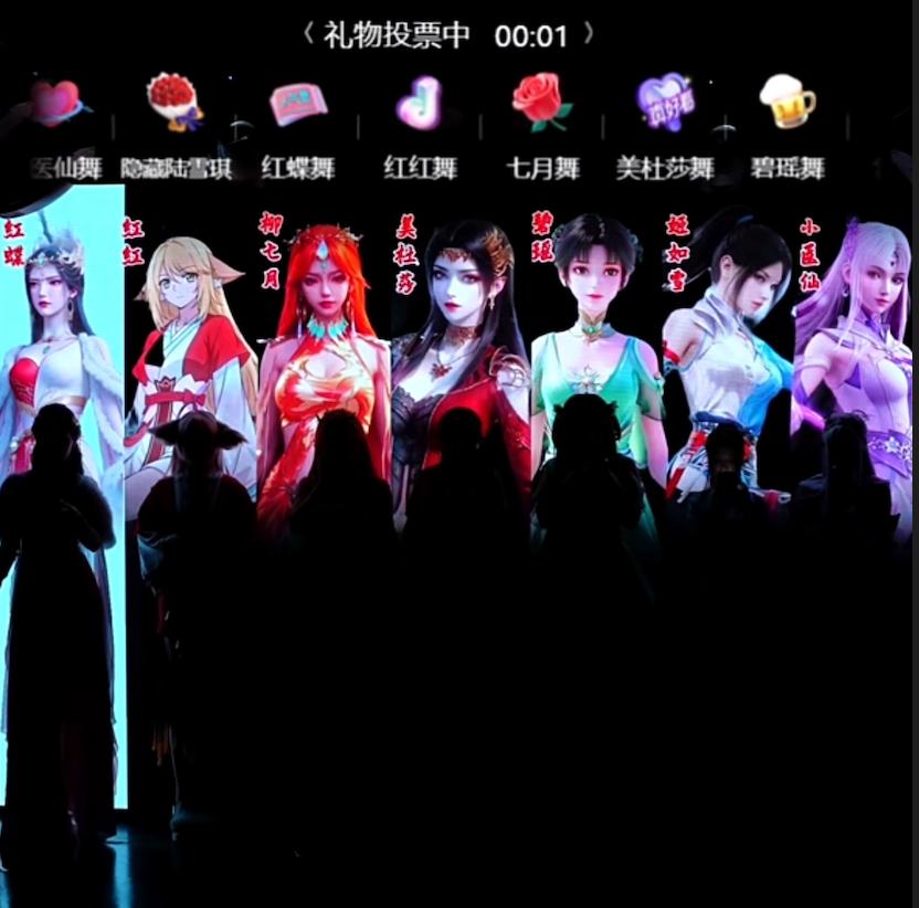 “关灯投票,开灯吓你一跳”是抖音上二次元团播初期的核心玩法。穿着各种二次元角色cosplay的主播站成一排,进行1-2分钟倒计时投票,由观众送礼物选出一位,开灯后这位主播进行1分钟内的才艺展示。