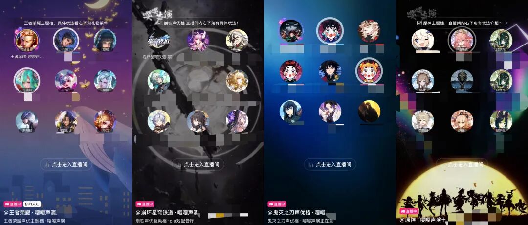 如果观众在团播直播间失去了眼睛,那么没关系,还有机会在语音房失去耳朵,以二次元配音演绎pia戏为主要内容的“嘤嘤”语音厅遍地开花。原神主题的、王者荣耀主题的、鬼灭之刃主题的、疯狂动物城主题的……应有尽有,声卡一开,混响调到最大,谁能想到十几年前在YY频道火热的pia戏还能在2025年的抖音吃上二次元这碗饭。除了语音厅,还有单人厅“配音电台”,玩法基本一致,刷礼物可以解锁角色关键台词、金句复刻、反差试音、小剧场、定制剧本等不同服务。但除了极少数真的有点像的主播能达到网配水平,更多都是顶着角色头像的四不像。