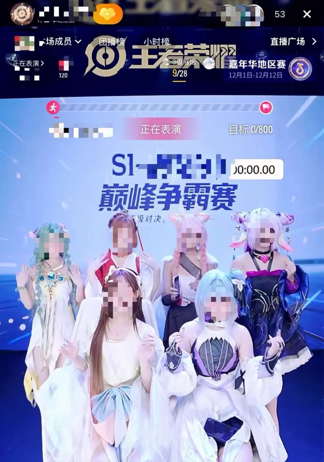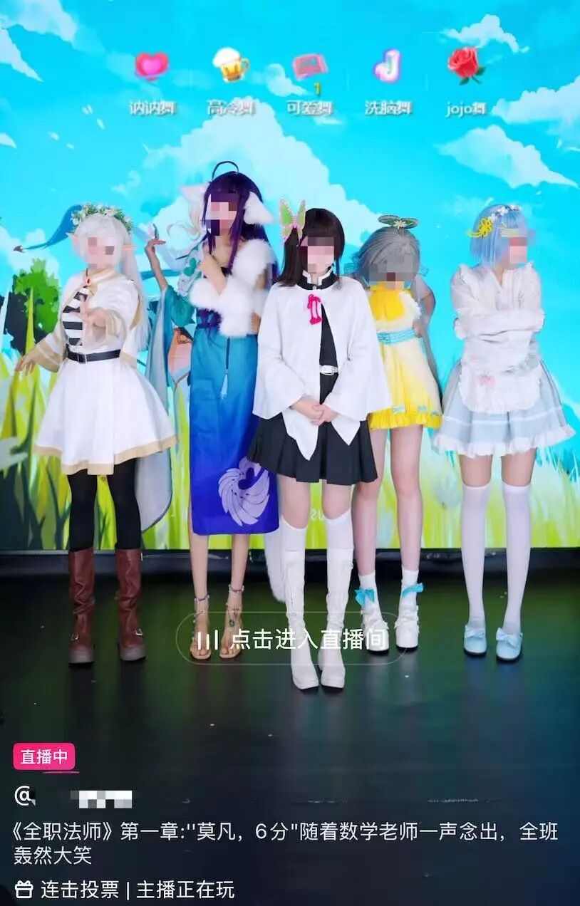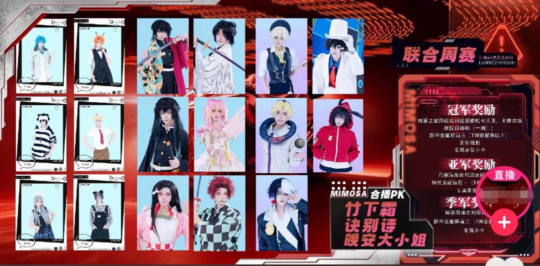 Cosplay衣服是自设居多,同色系衣服带个假发,或者粗制滥造的量产cos服;妆面是为了直播上镜化的团播浓颜,统一采用厚眼影和大卧蚕,与所出角色人设毫无关系;表演的节目是抖音神曲或者网红bgm唱歌跳舞;张嘴就是亲亲宝宝家人们救救我,帮我刷礼物投票的团播经典爆麦尖叫,真有人刷个火箭就开始解锁感动哭泣,感谢有你们陪着我,这一路多么不容易。