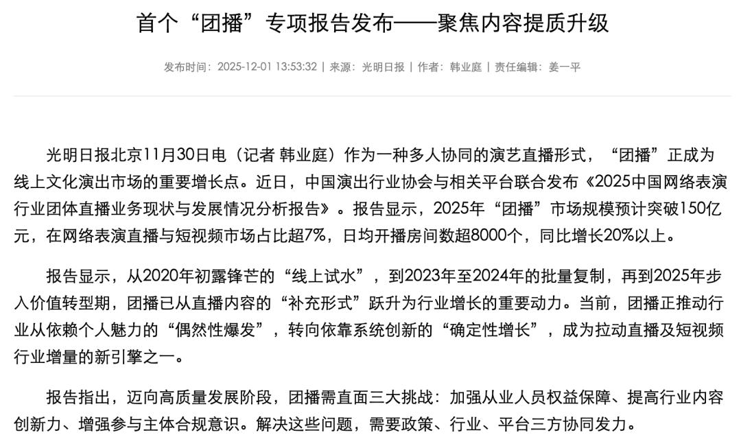 11月30日,中国演出行业协会与相关平台联合发布《2025中国网络表演行业团体直播业务现状与发展情况分析报告》。作为首个团播专项报告,该报告显示,2025年“团播”市场规模预计突破150亿元,在网络表演直播与短视频市场占比超7%,日均开播房间数超8000个,同比增长20%以上。报告指出,迈向高质量发展阶段,团播需直面三大挑战:加强从业人员权益保障、提高行业内容创新力、增强参与主体合规意识。解决这些问题,需要政策、行业、平台三方协同发力。