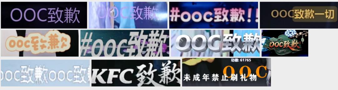 后来,连“ooc致歉”这种骗小孩的免责声明,也开始花里胡哨起来,丝毫没有致歉的意思,有的直播间干脆直接写成了“KFC致歉”,甚至因为不懂什么是ooc但知道致歉不能理直气壮,所以省略了“致歉”只剩下“ooc”。