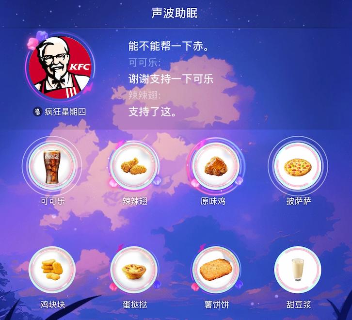 要不说二次元的钱是真好挣,与其听这些莫名其妙的ooc语音厅,还不如去疯狂星期四主题厅,围观蛋挞、薯条、可乐、红豆派、披萨、辣翅、土豆泥,全开麦叽叽喳喳,叫哥哥姐姐爸爸妈妈喵喵汪汪汪,还显得没那么失去梦想。