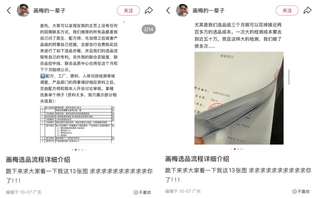 其中,@画梅 特别提及了职业生涯中两次较大的争议事件:一次是刚走红时与某品牌联名推出的粉底液因使用感不佳,他自掏腰包承担全部售后与退款;另一次是某次带货眼霜时,因功效报告遭同行质疑,他自费30万元送检,并邀请10位眼科医生参与观察,最终验证产品功效。