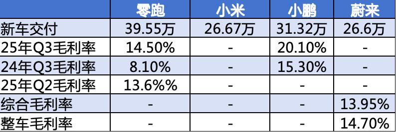 2025年前三季度,零跑、小米、小鹏、蔚来分别累计交付新车39.55万辆、26.67万辆、31.32万辆和26.60万辆。