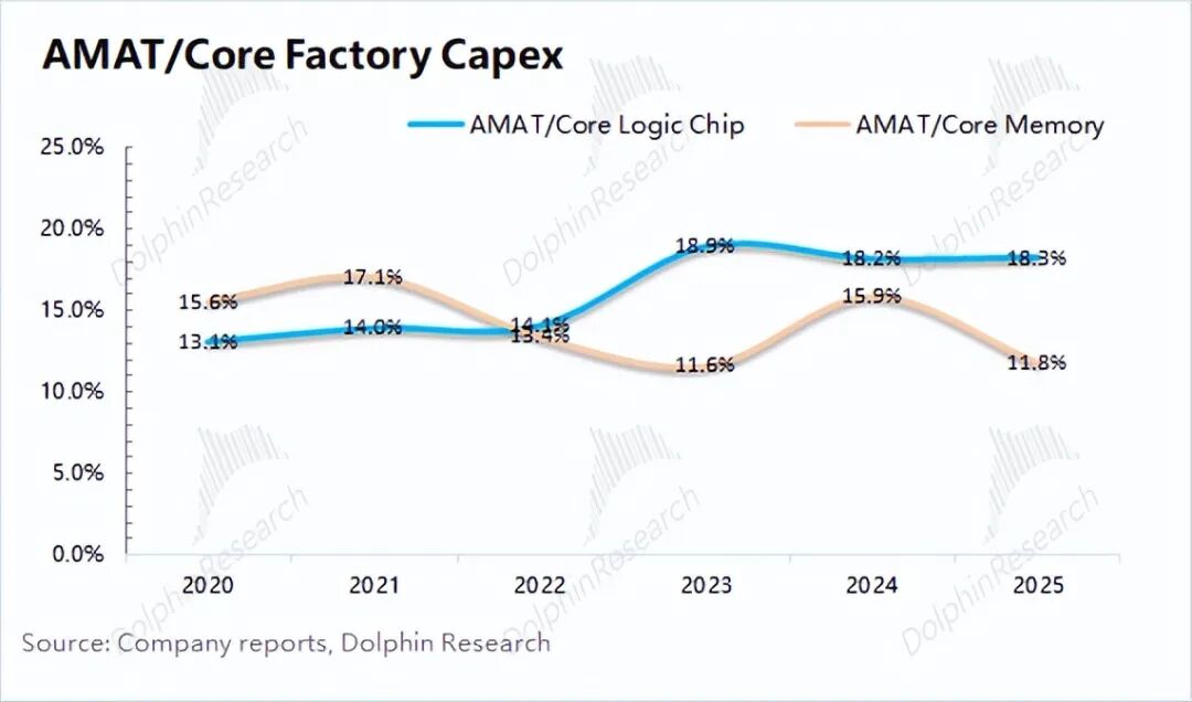 b)公司自身战略调整:应用材料AMAT公司将更多的精力投入到了AI驱动的逻辑类业务中,但AI基本台积电一家独大,AI制造产能可以复用手机芯片拉练过的产能,而非存储类产品,这也间接导致了公司在存储市场中竞争力的下滑。