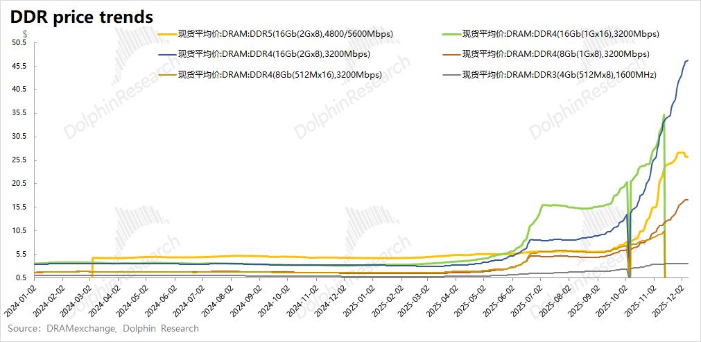 进入下半年,存储市场出现了转机。随着数据中心对存储的需求,从HBM进一步向外延伸至传统存储领域(DDR、NAND等),所有存储产品的价格都出现了明显上涨。参考下半年以来的DDR价格,这直接反映了当前存储行业全面回暖的情况。
