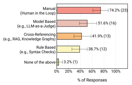在这种情况下,人工循环验证(Human-in-the-loop)是主导的评估方法,被74.2%的从业者采用。