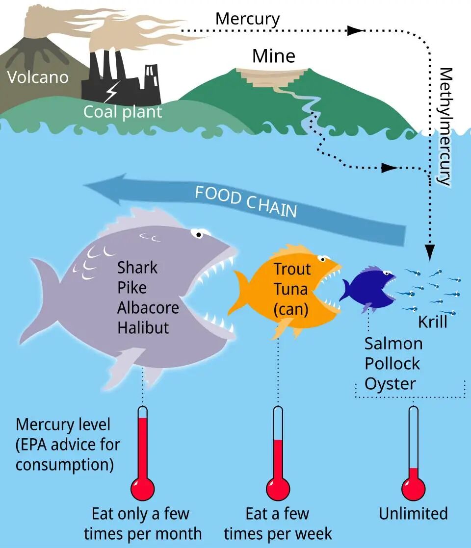 汞污染会被微生物转化为甲基汞,并随着食物链逐渐在生物体内富集 | Wikipedia