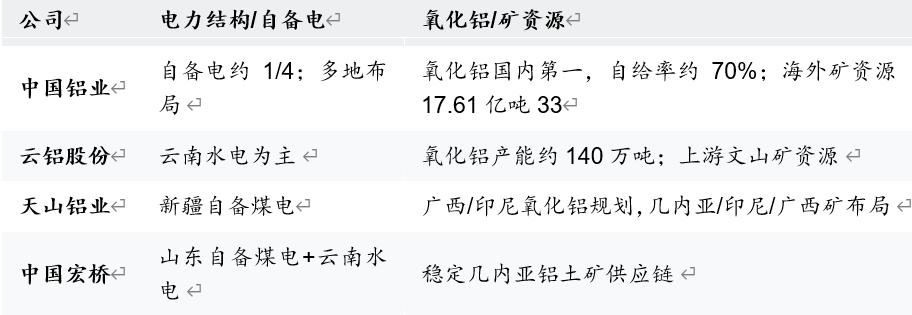 此外还纷纷以一体化布局为核心,中国宏桥、中国铝业、云铝股份等龙头企业均实现了“铝土矿 - 氧化铝 - 电解铝 - 铝加工”的全产业链覆盖,中国宏桥氧化铝产能自给率超过 160%,不仅保障了成本稳定,还能通过外售氧化铝增加利润。