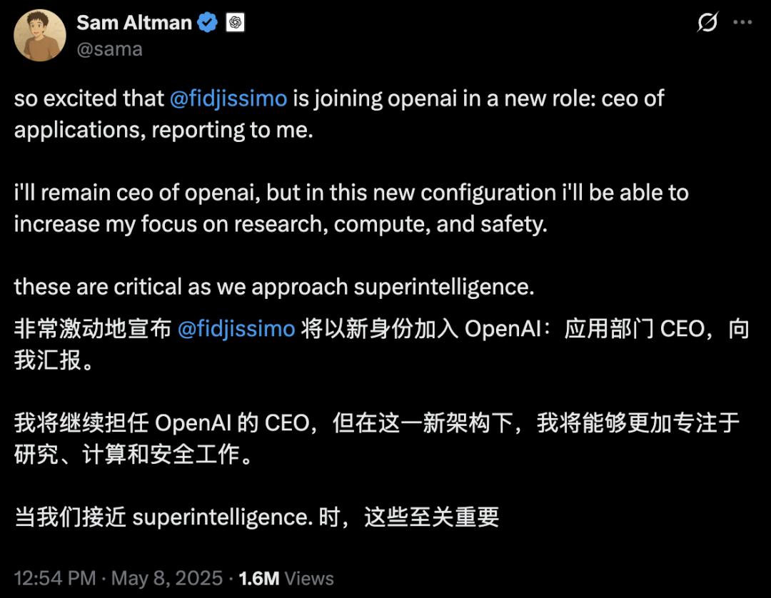 今年5月,奥特曼激动地宣布了Simo将加入OpenAI担任应用部门CEO的消息。