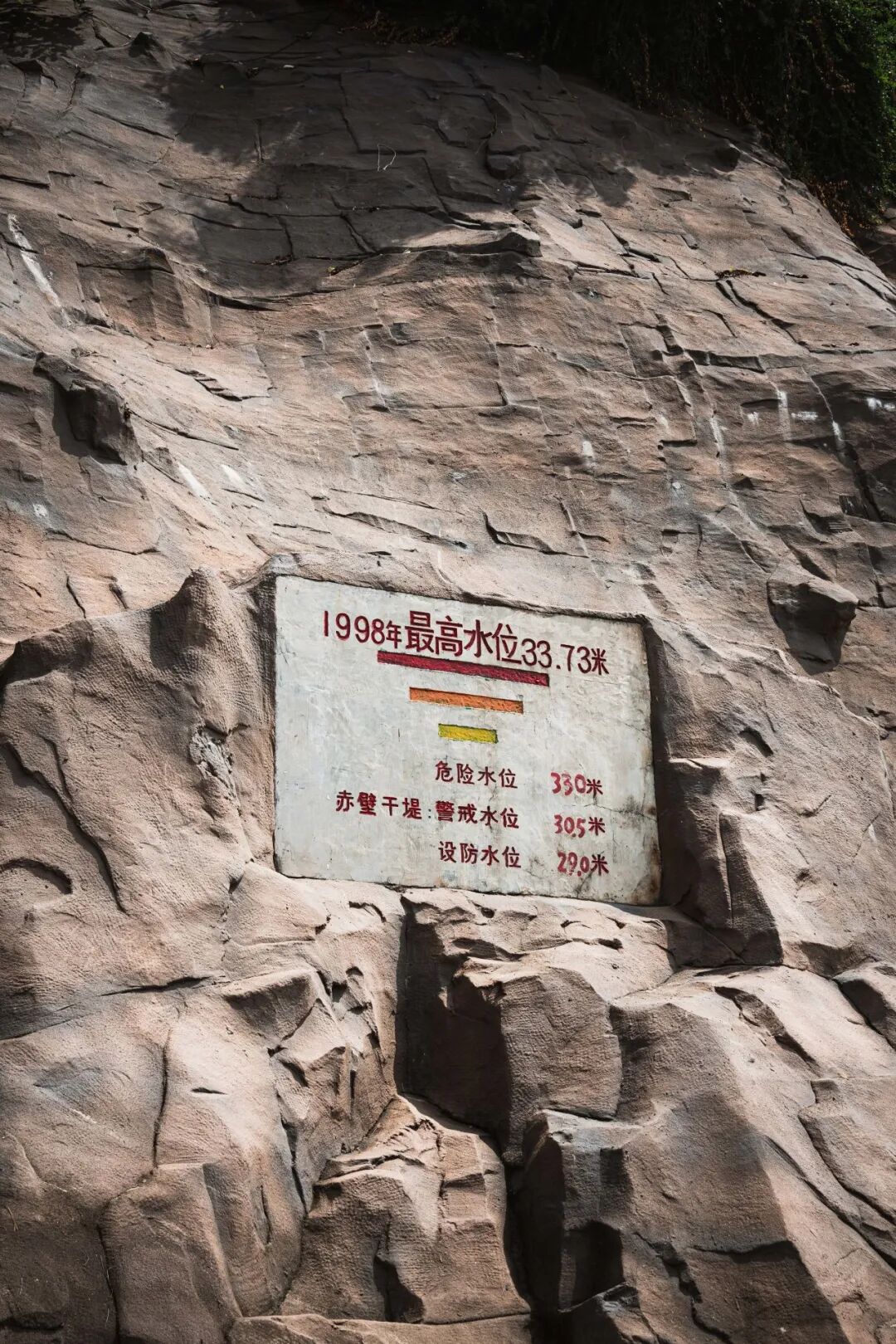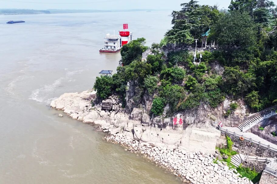 临江矶头地势开阔,长江在这里拐了一道弯,夏天涨水的时候,江面更宽阔,站在江边会更觉壮观。江边真有“赤壁”二字的摩崖石刻,鲜红的字正迎着吹来的东风,江水拍岸,站在栏杆边会感觉天地之大,人显得很渺小。