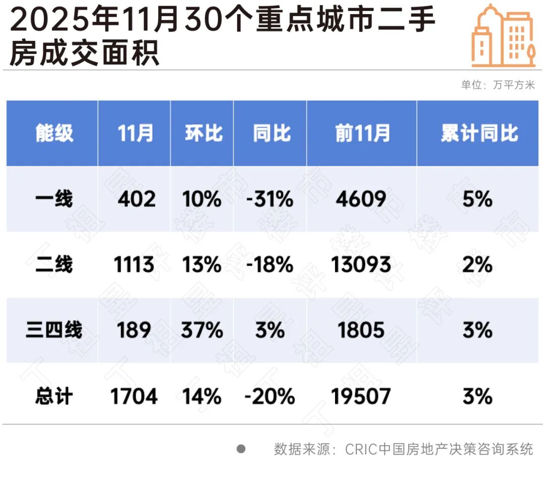 CRIC数据显示,2025年11月重点30个城市二手房成交面积1704万平方米,环比上升14%,累计来看,前11月30个重点城市二手房成交面积19507万平方米,累计同比上涨3%。