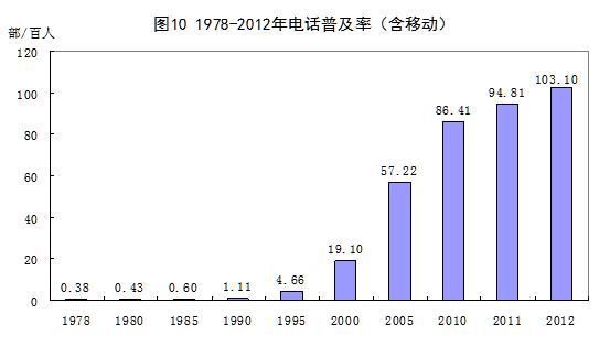 据统计,我国的固定电话用户从1978年的192.5万户,到2012年底,提高到了2.8亿户,增长143.5倍,电话普及率也从0.38%提升到了103.1%。