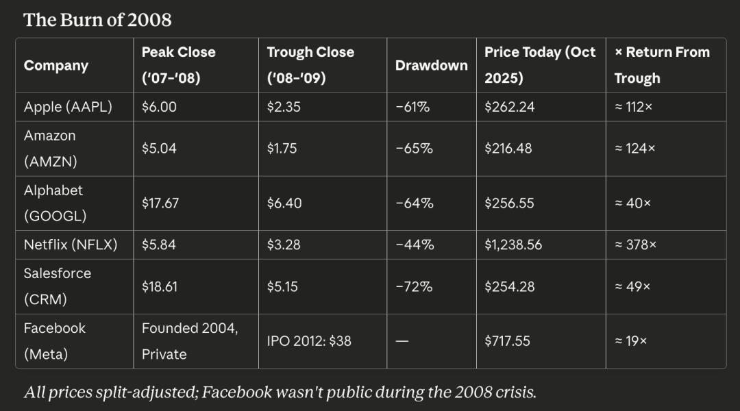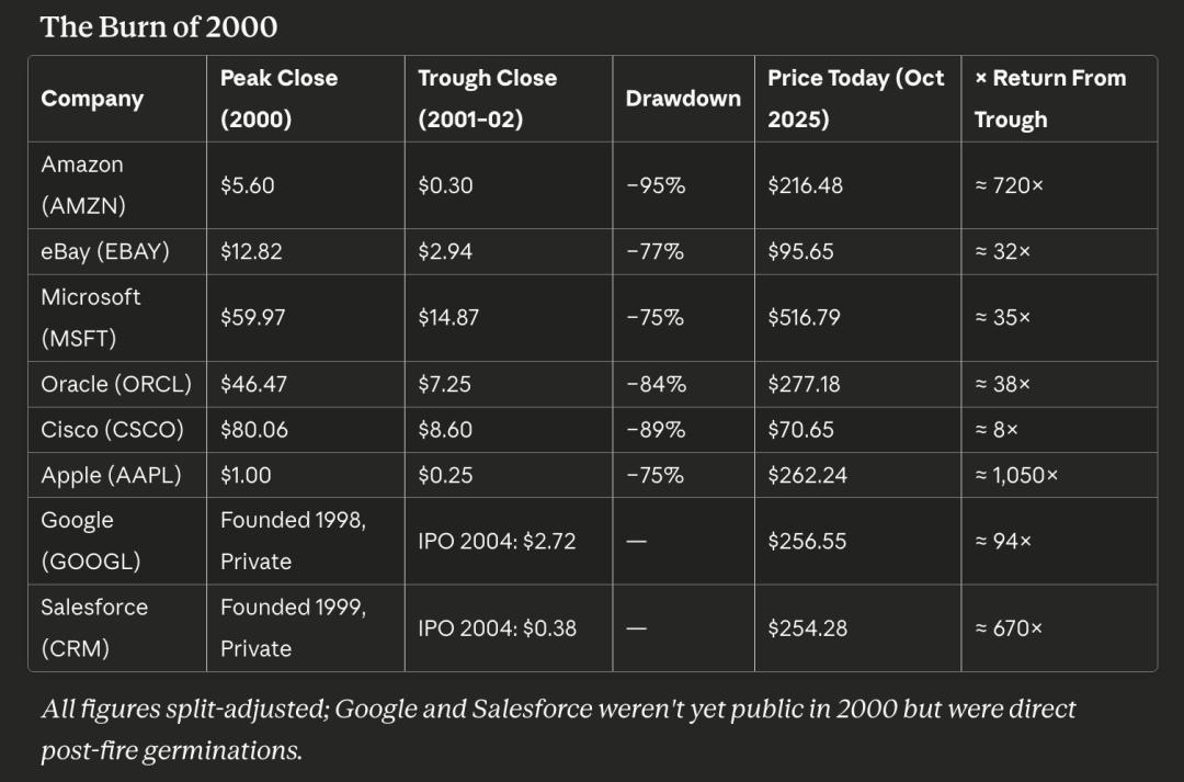 2000 年那场野火几乎是一次彻底的焚毁。过度建设的基础设施、泛滥的资本和投机狂热一起,把几乎所有“无利润的增长故事”都烧成了灰。但留下来的,是根系:数据中心、光纤网络,以及那些学会“长得慢、扎得深”的幸存公司。