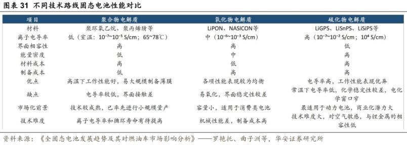按照电解质材料类型的不同,固态电池技术可以分为氧化物、聚合物、硫化物、卤化物四种技术路线。其中,聚合物固态电解质技术较为成熟,发展最迅速,但电导率低、化学稳定性较差;氧化物路线化学性质稳定、安全性高,但离子电导率较低,且材料较脆;卤化物在实际应用中面临更多技术和工艺挑战,目前仍处于实验室阶段。