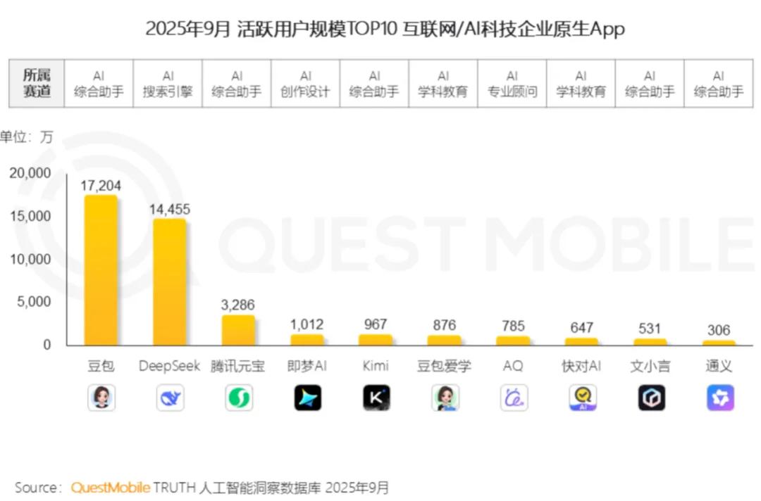 QuestMobile9月数据显示,中国AI应用MAU排名前三为豆包1.72亿、DeepSeek1.45亿和腾讯元宝3286万。而通义位列第十,MAU仅306万。