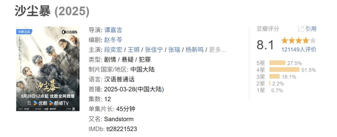 另外,去年参与过《春色寄情人》等项目的磨铁娱乐今年的重点项目有《沙尘暴》《深情眼》《即刻上场》,其中《沙尘暴》以8.1的豆瓣评分在2025悬疑剧中展现强烈后劲。