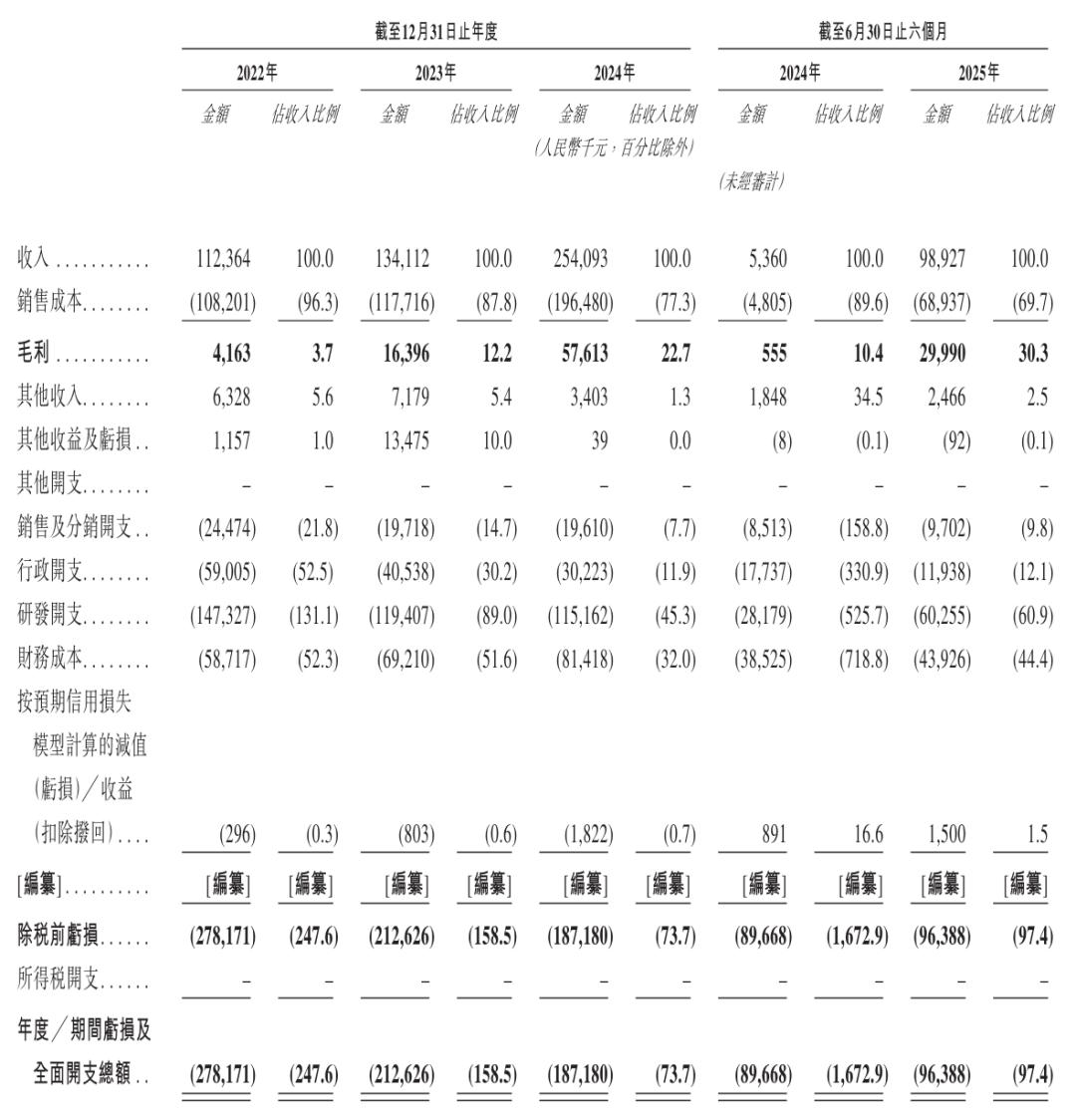 招股书显示,主线科技2022年、2023年、2024年营收分别为1.12亿、1.34亿、2.54亿;毛利分别为416万、1640万、5761万;毛利率分别为3.7%、12.2%、22.7%;期内亏损分别为2.78亿、2.13亿、1.87亿。