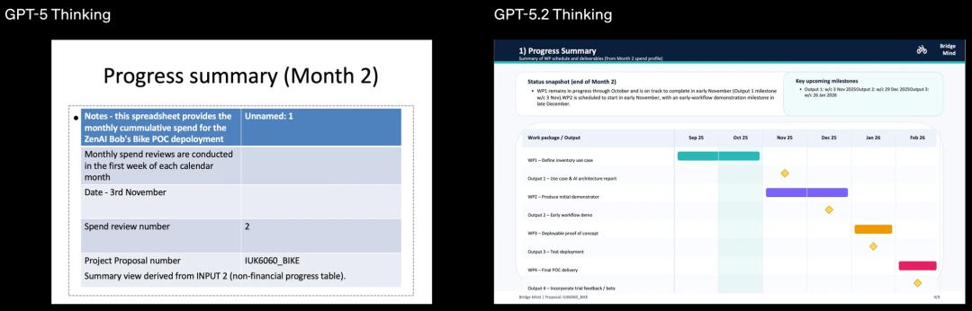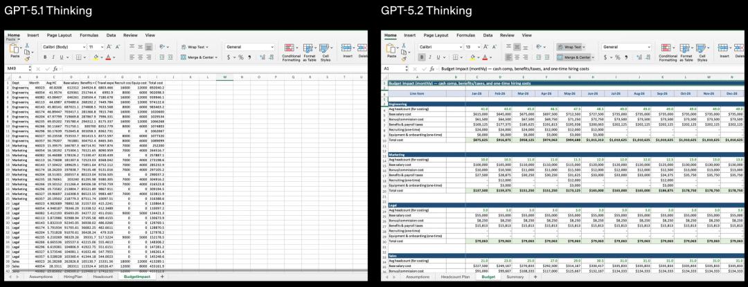 并排比较显示,GPT‑5.2 Thinking生成的电子表格和PPT在复杂度和格式上都有所改进。
