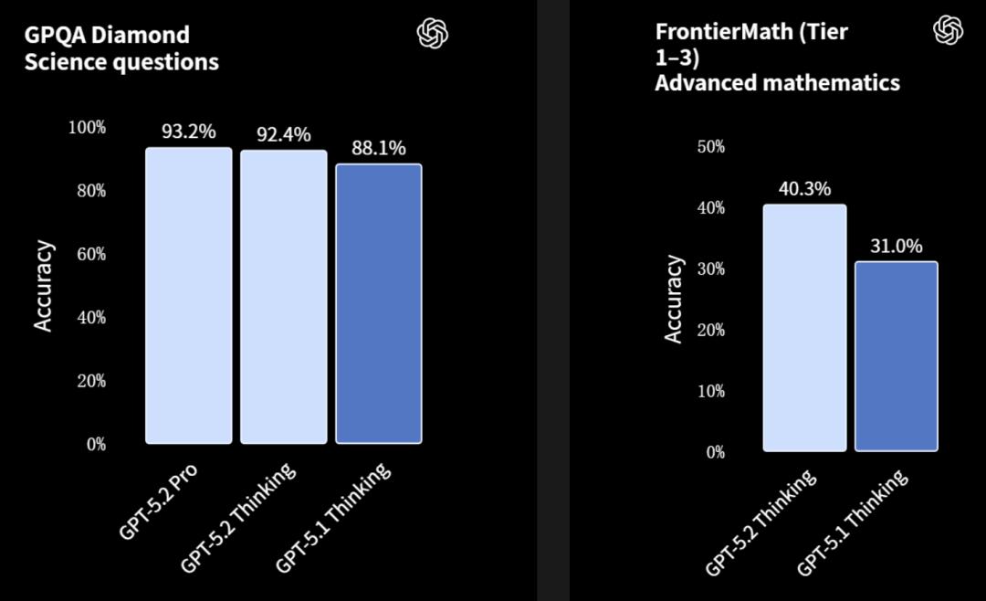 在研究生水平基准测试GPQA Diamond上,GPT‑5.2 Pro达到了93.2%,紧随其后的是GPT‑5.2 Thinking,为92.4%。