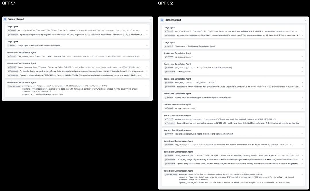 GPT‑5.2管理了整个任务链——重新预订、特殊协助座位和赔偿,提供了比GPT‑5.1更完整的结果。
