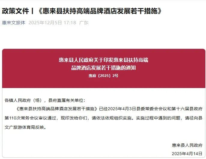 就在前两天,广东惠来县文体局把今年4月份制定的《惠来县扶持高端品牌酒店发展若干设施》的优惠政策,又在它们的官方平台上推送了一次。