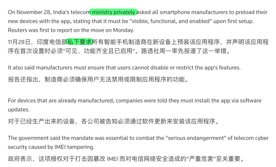先说社会影响的部分,路透社在报道这件事的时候提到了,印度电信部是私下要求手机厂商们去预装该应用程序的。