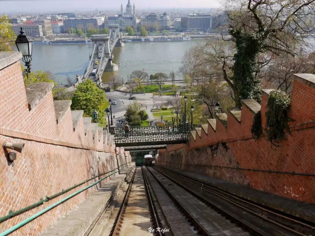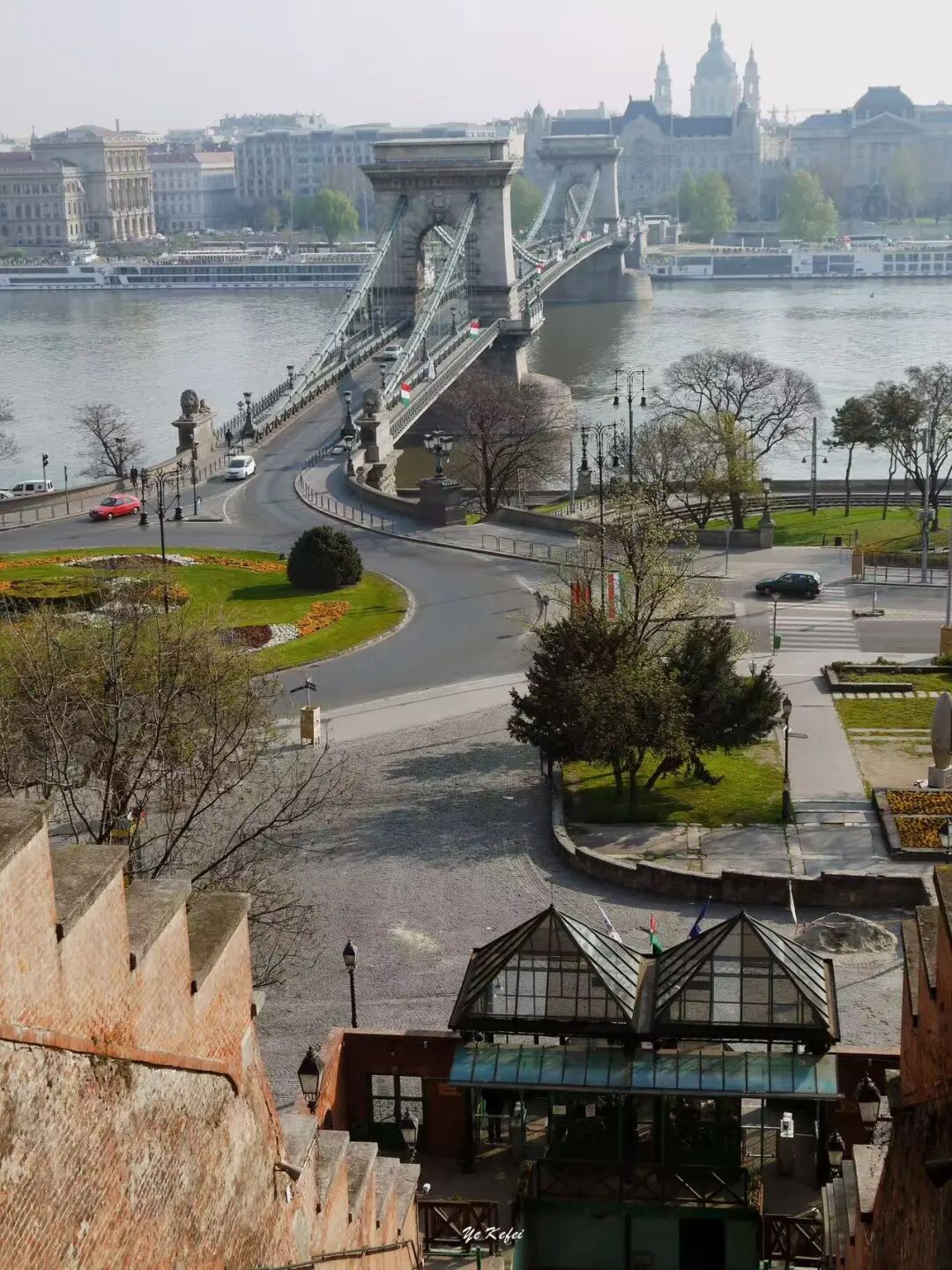 登上城堡山,可以沿老城山路兜兜转转绕行而上,也可以在山脚下乘坐百年历史的老缆车。其实城堡山地势不算高,最高海拔处也只有167米,慢悠悠溜达上去也只不过十几分钟脚程,缆车的吸引力在于它是一个移动观景台,随着缆车缓缓而上,布达佩斯最知名的大桥——链子桥也跟着浮现于眼前。