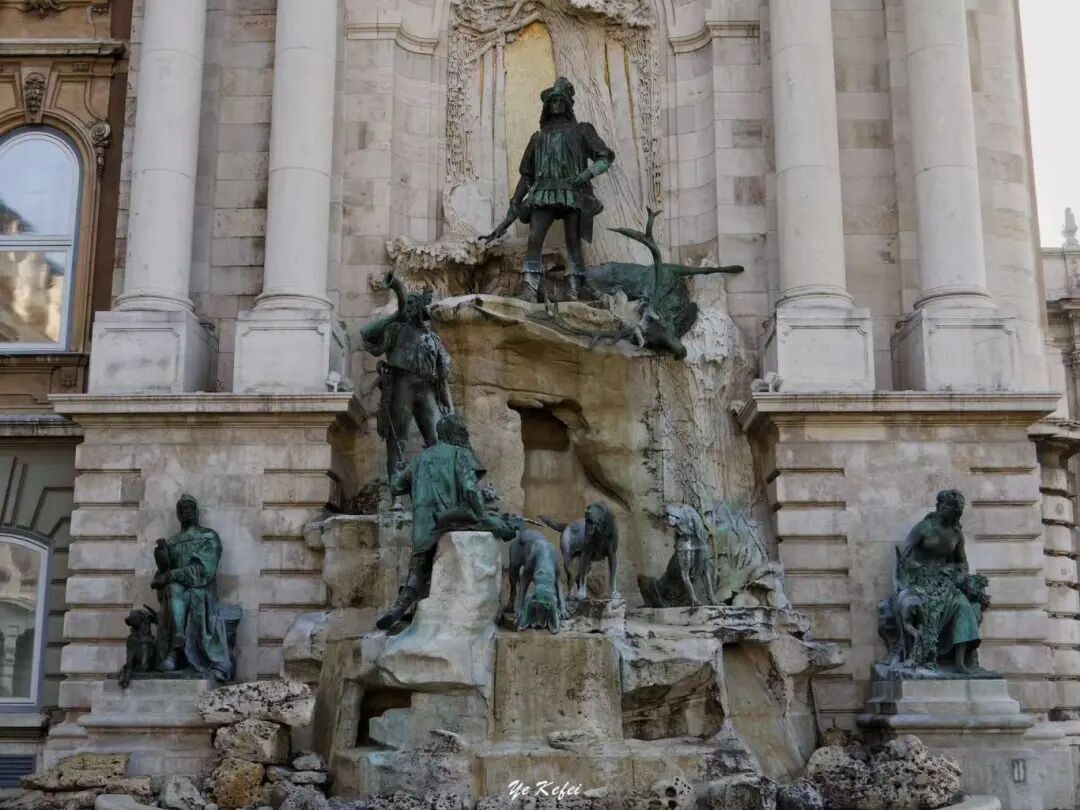 宫殿前院的壮观喷泉是马蒂亚斯喷泉,描绘了马蒂亚斯·科维努斯国王打猎的场景,由雕塑家阿拉霍斯·斯特罗布尔所建造。如果是2021年之前到访布达佩斯,就会在它旁边见到一座马群雕像。马群雕像描绘的是匈牙利霍托巴吉国家公园驯服野马的场景,1900年曾在巴黎万国博览会上展出,1901年开始摆放在布达城堡的骑术学校前,二战中受损,1960年代被拆除,1983年修复后放置于马蒂亚斯喷泉旁。