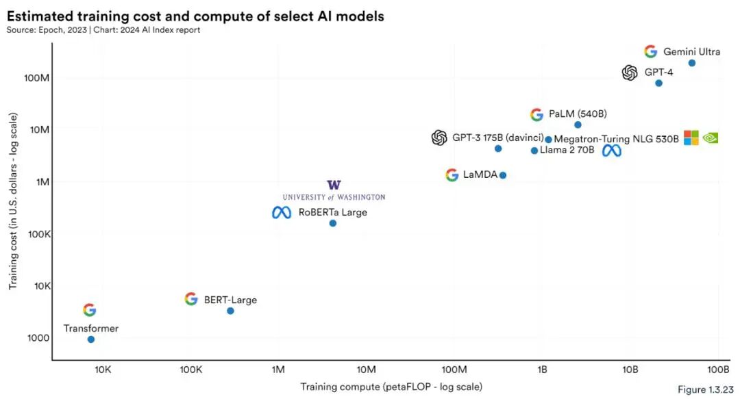 根据斯坦福HAI研究所发布的第七个年度AI Index报告,其揭示了人工智能行业的现状。报告指出,随着时间的推移,模型的训练成本在急剧增加,尤其计算训练需求越大模型的训练成本越高。(如下图)