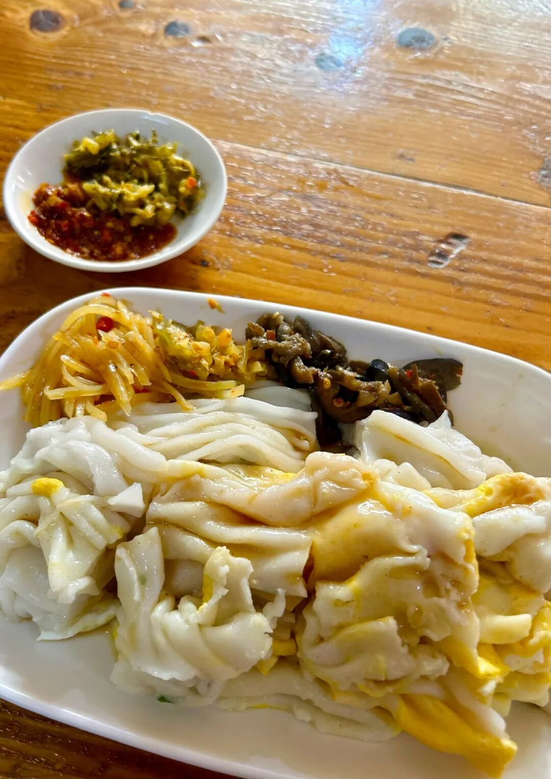 在刘记小吃店吃到的肠粉,粉皮比较厚,可以加很多种小菜,其中亦有酸菜和茄子。