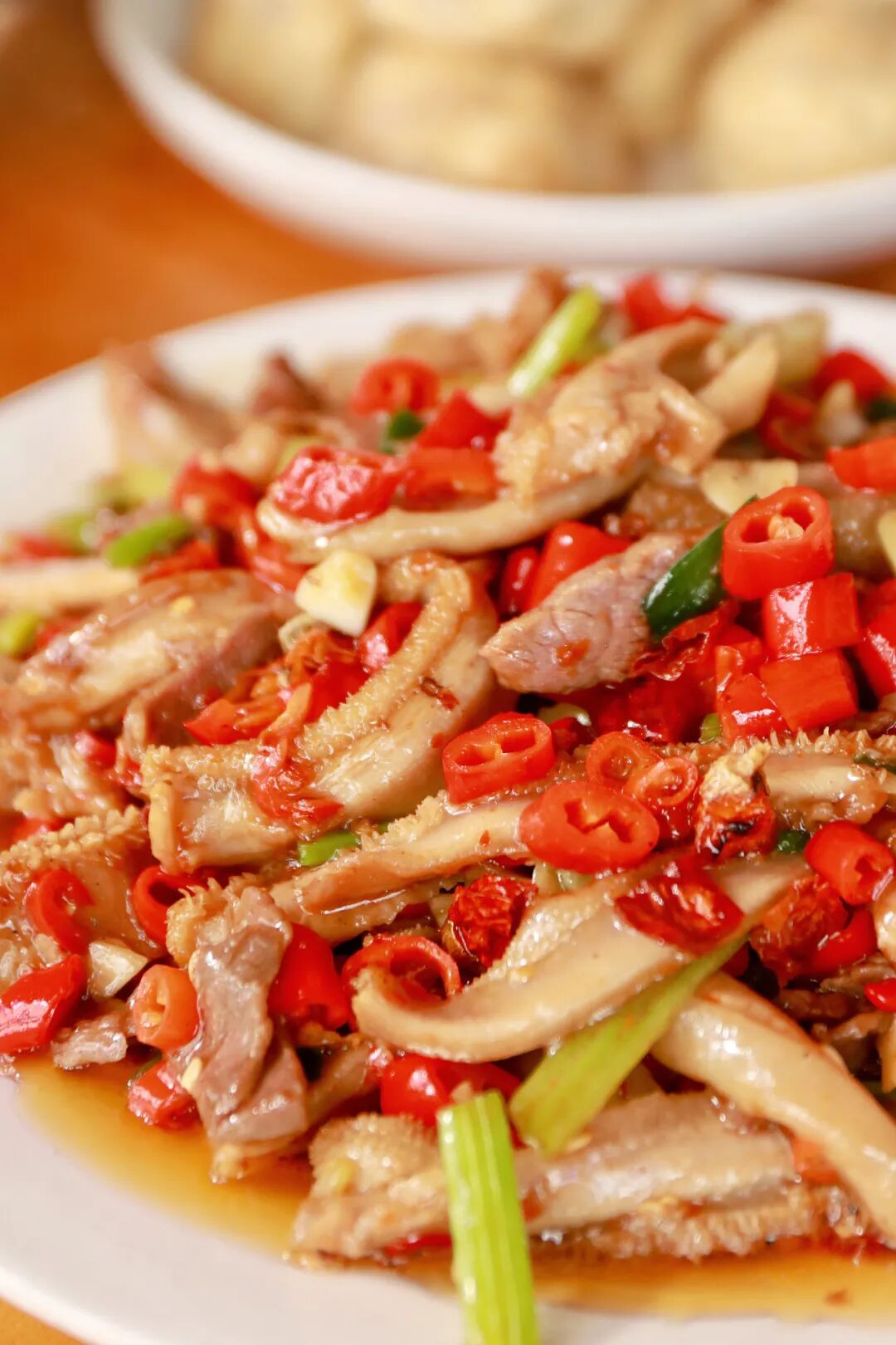 牛三宝虽然也出现了几种辣椒,只不过都是没那么辣的鲜椒,牛肉、牛肚和百叶提供了三种不同的口感,是一道很美妙的下饭菜。