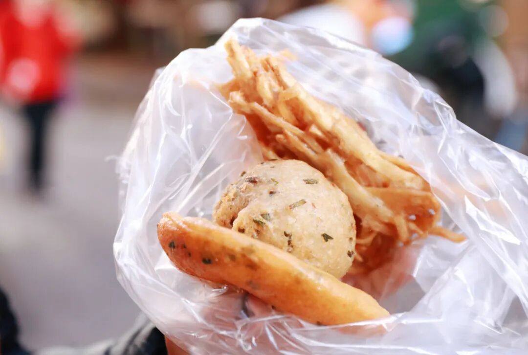像铜勺饼、炸芋头丸子/芋头条/芋头片、炸辣椒,一咬嘎嘣脆,很香很香,可以买回去当手信。