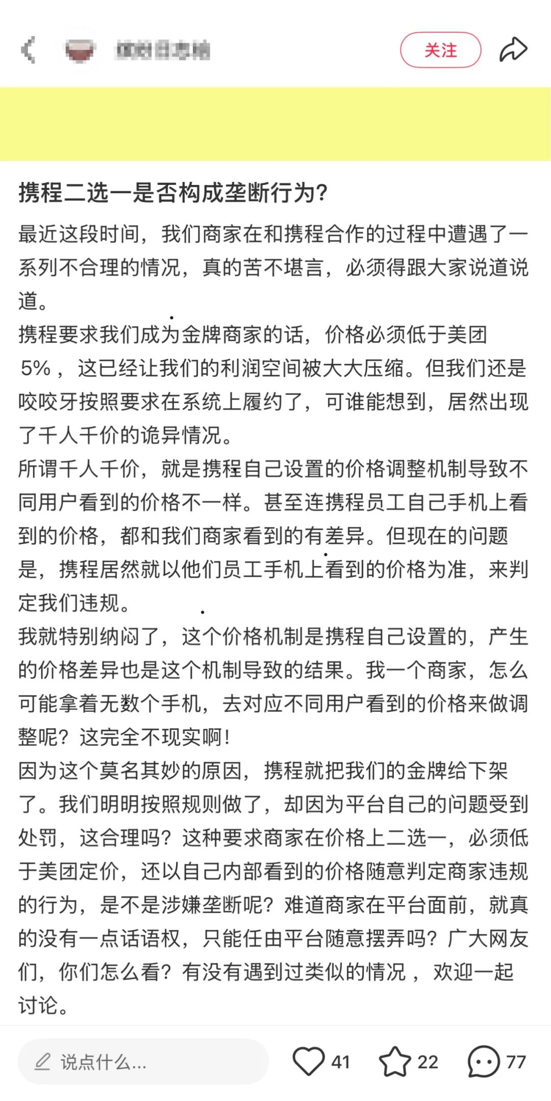 在消费调解平台黑猫投诉上,有携程特牌商家表示,其严格遵守不与美团合作的约定,但携程通过钓鱼测试,订单在酒店商户并不知晓的情况下经倒卖由飞猪卖出,最终被携程处以“限流15天”的处罚;在小红书上,也有商家表示成为携程金牌需承诺价格低于美团5%;今年6月,更是有酒店商家集体公开爆料,称携程平台在未与酒店沟通的情况下,通过“调价助手”工具擅自修改了他们在平台上所设置的房价。