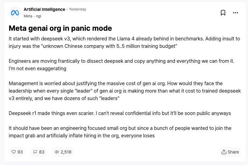 当时,社交网络上流传出一份内部信显示,Meta 的生成式 AI 团队陷入了恐慌状态。“一切始于 DeepSeek V3,它让 Llama 4 在基准测试中落后。”“工程师们正疯狂地剖析 DeepSeek,复制一切能复制的东西。”